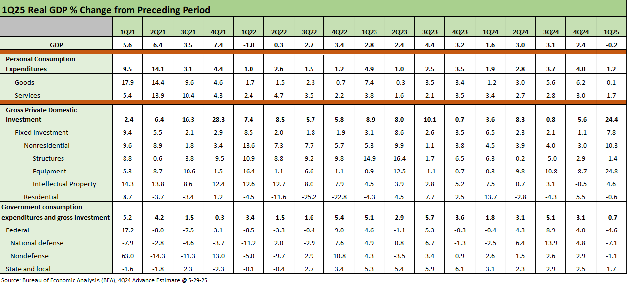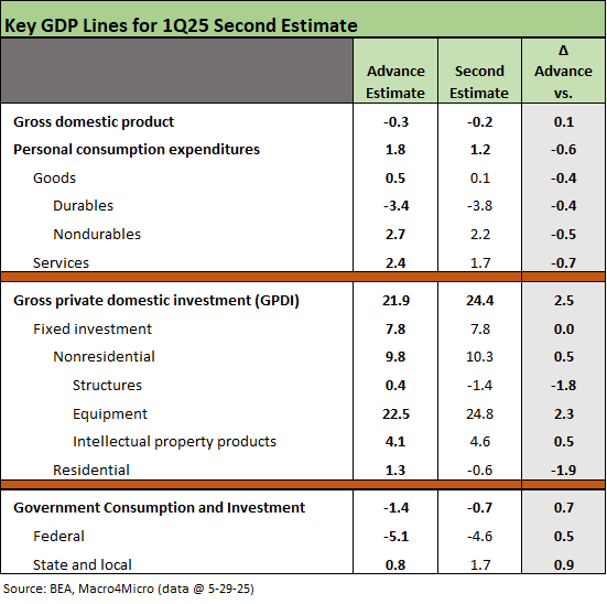 We see the headline 1Q25 GDP number slightly improve to a less negative number at -0.2% vs. -0.3% with mixed deltas in key lines such as PCE (worse), Equipment, (better), Structures (worse) and Government (better). The top line needle barely moved but there was action in the line items (see 1Q25 GDP Advance Estimate: Roll Your Own Distortions 4-30-25, 1Q25 GDP: Into the Investment Weeds 4-30-25).