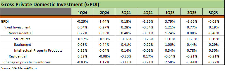 GPDI growth in 3Q25 was slightly negative with fixed investment growth in 3Q25 lower than 3 of 4 quarters in 2024. The Government contribution % to GDP was the highest of 2025 but lower than 3 quarters of 2024. Fixed investment lines have posted notable variances during the post-COVID stimulus period, but were low in 3Q25 at +0.19%, which is less than 3 of 4 quarters in 2024. Residential investment was negative for all 3 quarters in 2025.