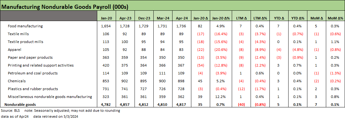 This chart covers the line items within Nondurables that makes up just over 3.5% of the private payrolls count. As covered above, the LTM delta is -40K and has only seen +35K since Jan 2020. Food manufacturing and chemicals make up the only positives in this group across the various time frames with all the other major categories in the red since Jan 2020.