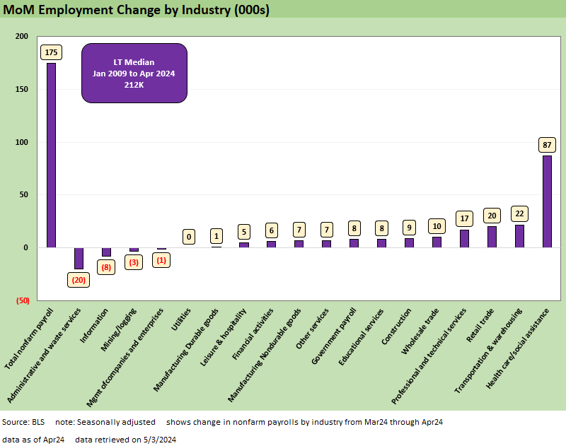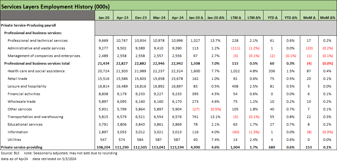 We also see the tech layoffs story playing out as Information jobs have declined -40K LTM and -8K in April 2024. These higher visibility layoffs are small in the services context and often overshadow the massive additions within the sector.
