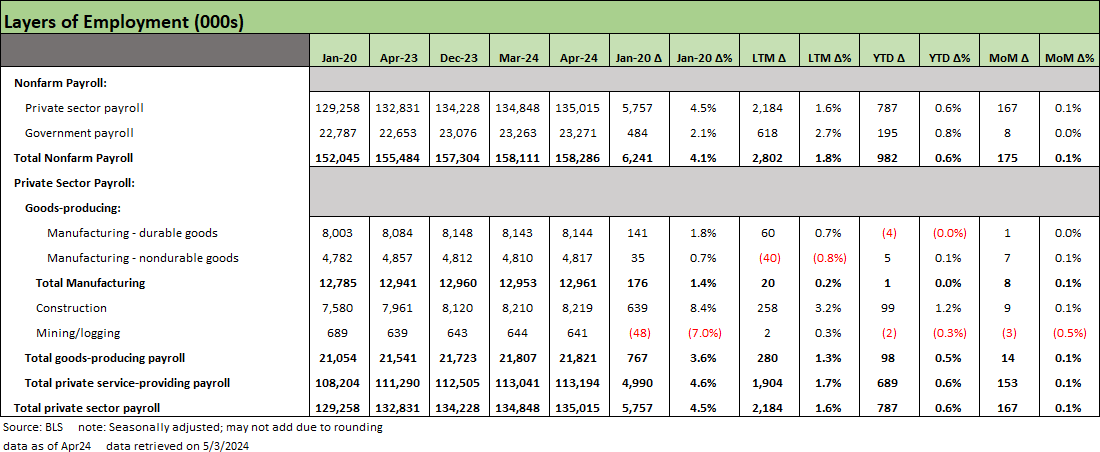 Earlier we already published our top-down view and historical trend lines for the payroll markets (see Payroll April 2024: Market Dons the Rally Hat 5-3-24). In this commentary, we get into the occupation lines.