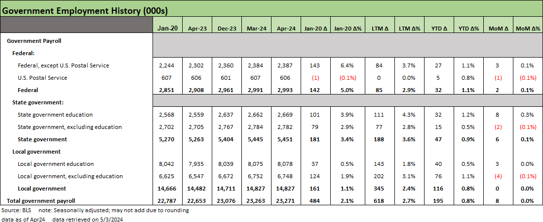 Lastly, we cover the government line items which hit the brakes this month after a decent start to the year. This month comes in as mixed and largely flat across the Government payroll stats. This LTM period (+618K) has seen government hiring go from negative to positive in the post-COVID period (+484K) with state and local leading the way at over 86% of the total Government adds LTM.