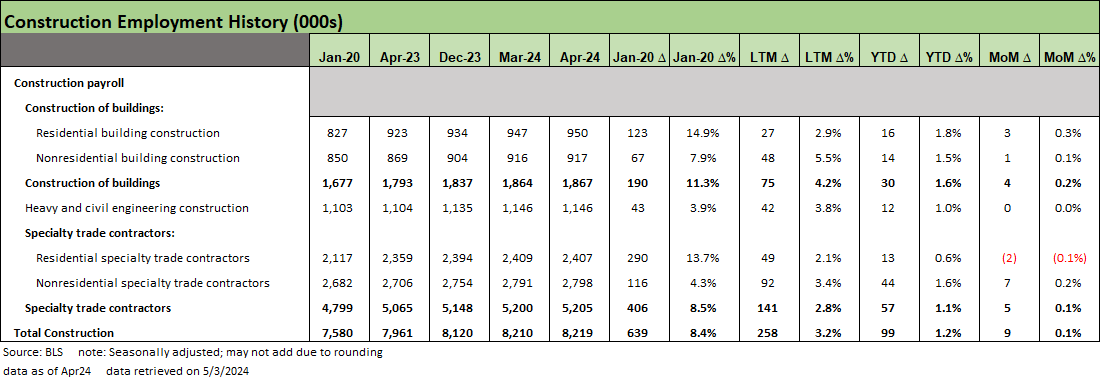 The above chart covers the construction line items that we look at regularly given the connection to real economic activity and policy initiatives enacted in recent years. A modest 9K adds this month frames up against +99K YTD and +258 LTM. Building construction job adds are relatively stronger, growing 75K LTM or 4.2% as the structural tailwind to homebuilding needs remains robust.