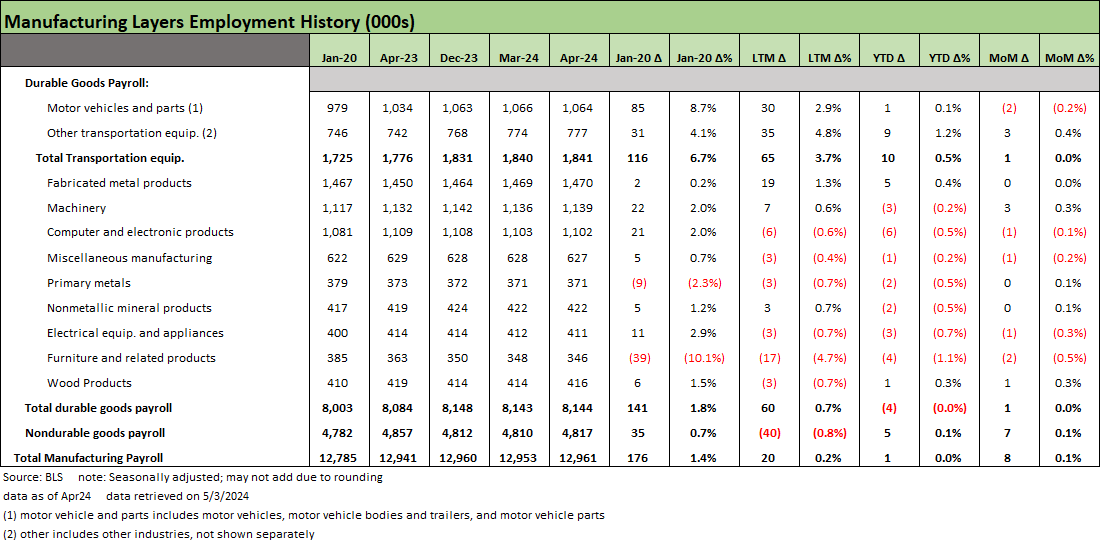The above chart covers Manufacturing broadly but mostly drills into the durable goods layers. Durables LTM at +60K offset the -40K Nondurables job adds but so far this year Nondurables is slightly positive (+5K) and Durables slightly negative (-4K). Transportation Equipment continues to contribute a greater amount than the overall Durables additions LTM (65K vs 60K), so that hides a very mixed bag of manufacturing line items across the rest of the group.