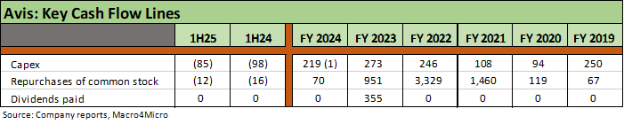 The above table underscores the low capex intensity and tech-centric service nature of the core rental business. The commentary from Avis on their desire to invest in growth marks a change from the massive buybacks seen from 2021 to 2023 and the special dividend paid in 2023 after the residual value boom and record margins (see Credit Snapshot: Avis Budget Group 4-9-25).