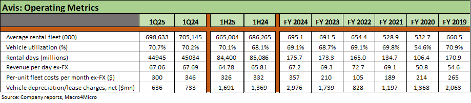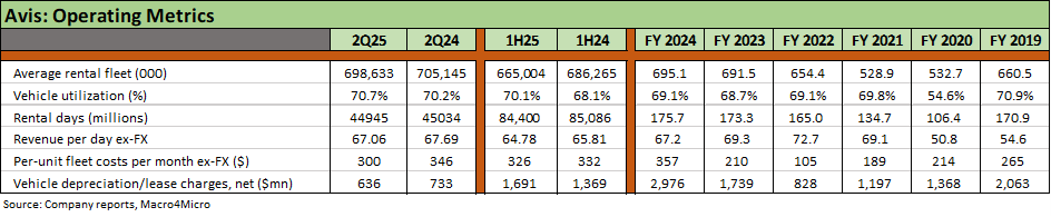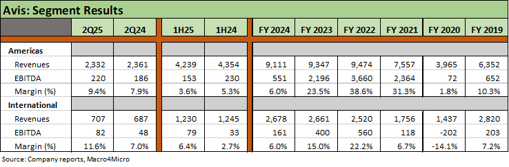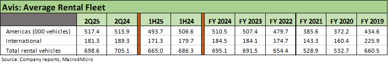 The above table highlights the trend line in fleet size, which is the core earning asset base that is generally funded separately by funding entities and securitization structures. Avis fleet size was growing again from 2021 to 2024 but has downsized YoY in 1H25. The Americas segment has grown from its size in 2019 while International has shrunk vs. 2019.