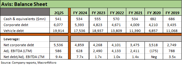The framing of corporate debt (i.e. ex-vehicle funding entities) vs. car rental EBITDA is the critical metric for EV multiples and gauging where the equity valuation could be framed. The running 9.4x Net debt/EBITDA is not helping the current story, and Avis did not give leverage much airtime for obvious reasons.