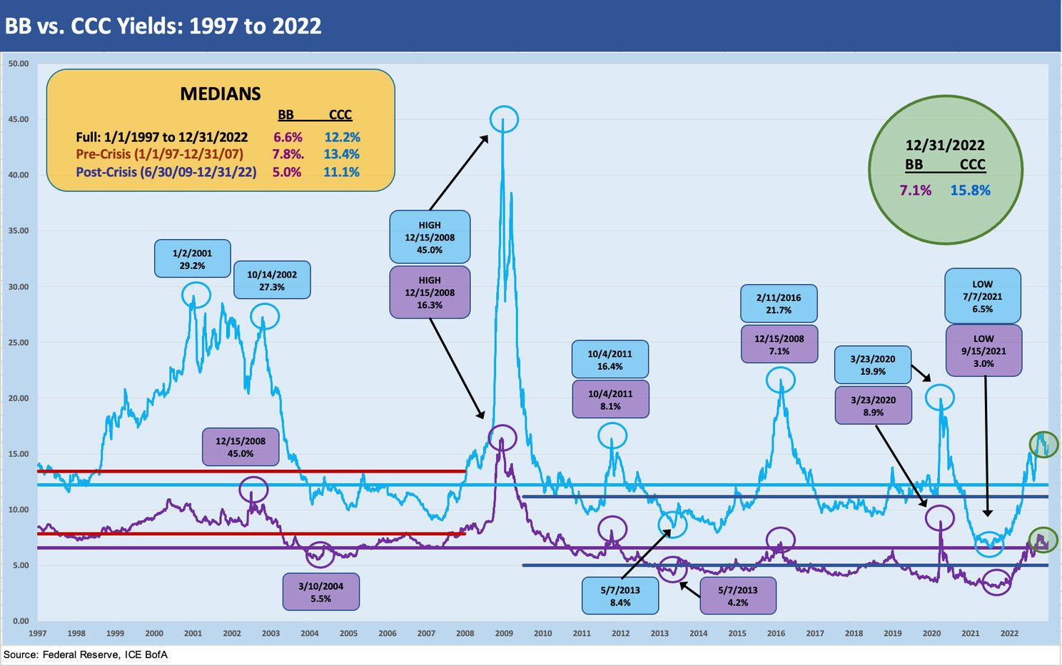 As highlighted in the median details in the earlier spread charts, the BB tier is hanging around the median (long term median of 311 bps, 2022 ended +308 bps). The CCC tier is wider than the median (+969 bps) to end 2022 (CCC at +1170 bps). The earlier spread chart plots how those spreads flow into a yield curve that rose materially across 2022. The yields and spreads work in tandem to generate an all-new expected return discussion. One can easily make the conceptual case that CCC bonds should generally be framed against expected returns for equities and not bonds. In contrast, BB bonds can be viewed as more bond-like and have a different risk expectations checklist.