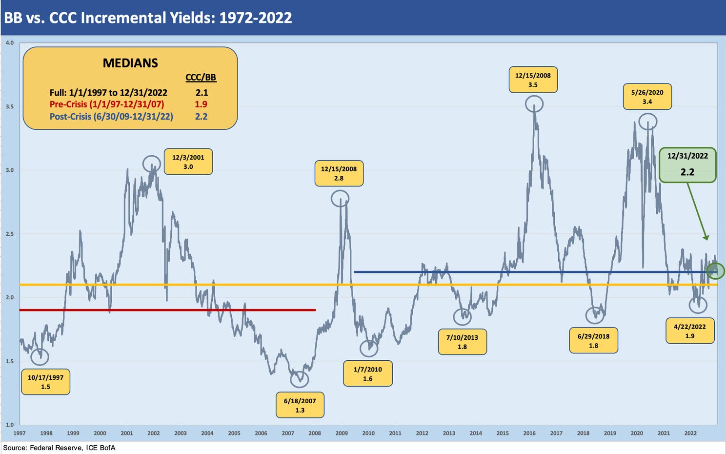 The main takeaway is that the yield relationship of the CCC vs. BB tier is hanging around the median currently. The spread relationship is moving above the median and will likely keep moving higher away from the median further into 2023, even if we have an early year rally. The CCC tier is always a name picking exercise with the best values found when the volatility is higher, the market more nervous, and the liquidity premium more material in scale. The CCC tier is not there yet vs. history.