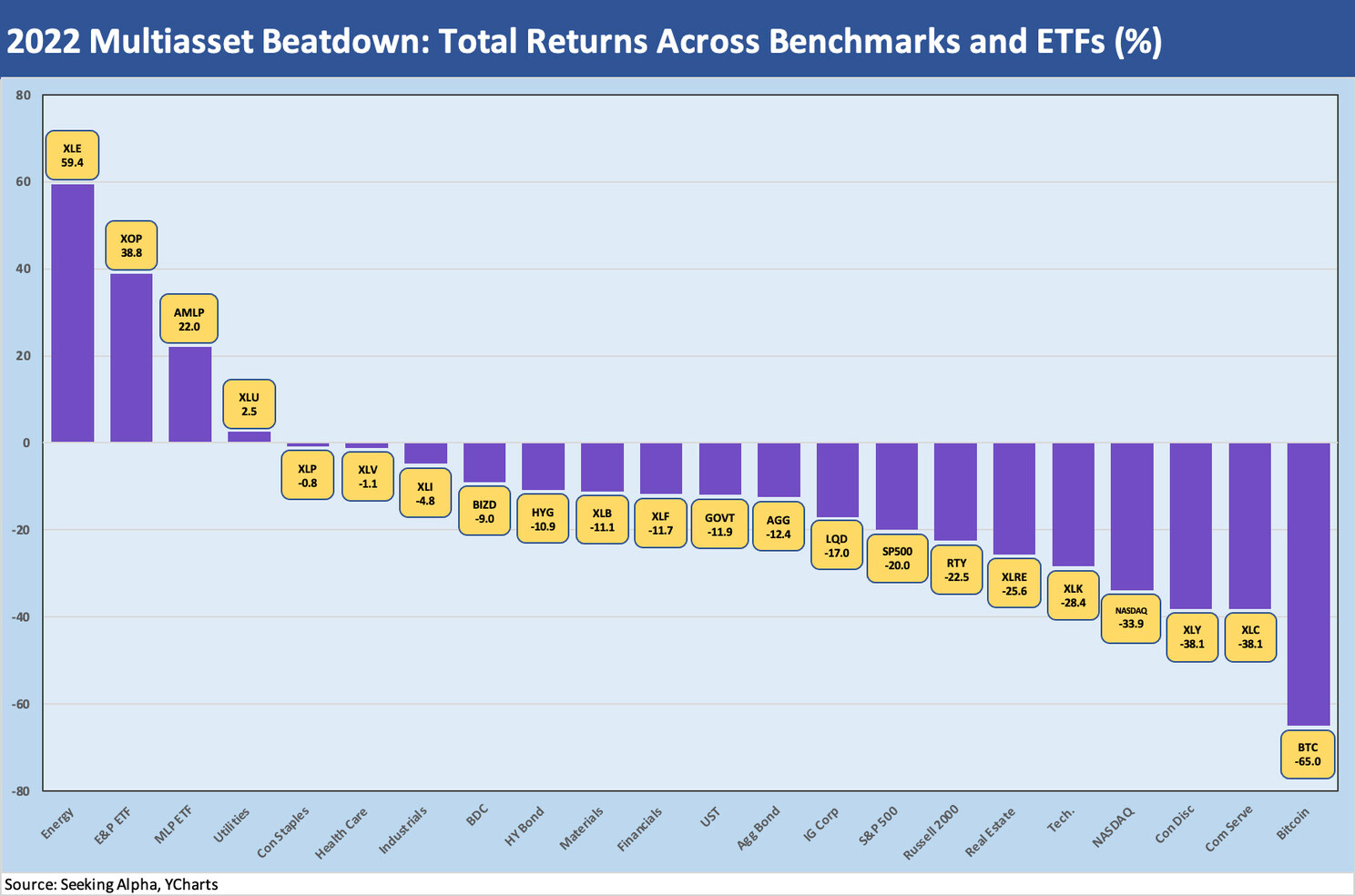 The performance of 2022 has given investors much to ponder from small to large. In a testament to what Fed tightening can do to performance by old school bond math, bonds were crushed alongside equities this year (see Multiasset Beatdown 12-31-22). US HY fundamentals were much stronger on average than during earlier negative return years, the issuer quality mix was higher (the high BB tier index share of almost half), and the industry concentration was better (e.g., a high energy mix in a bullish year for E&P financial health). So much for the value of diversification of risks in 2022. Those who toggled across bonds and equities did not see their risk mitigation strategy work too well.