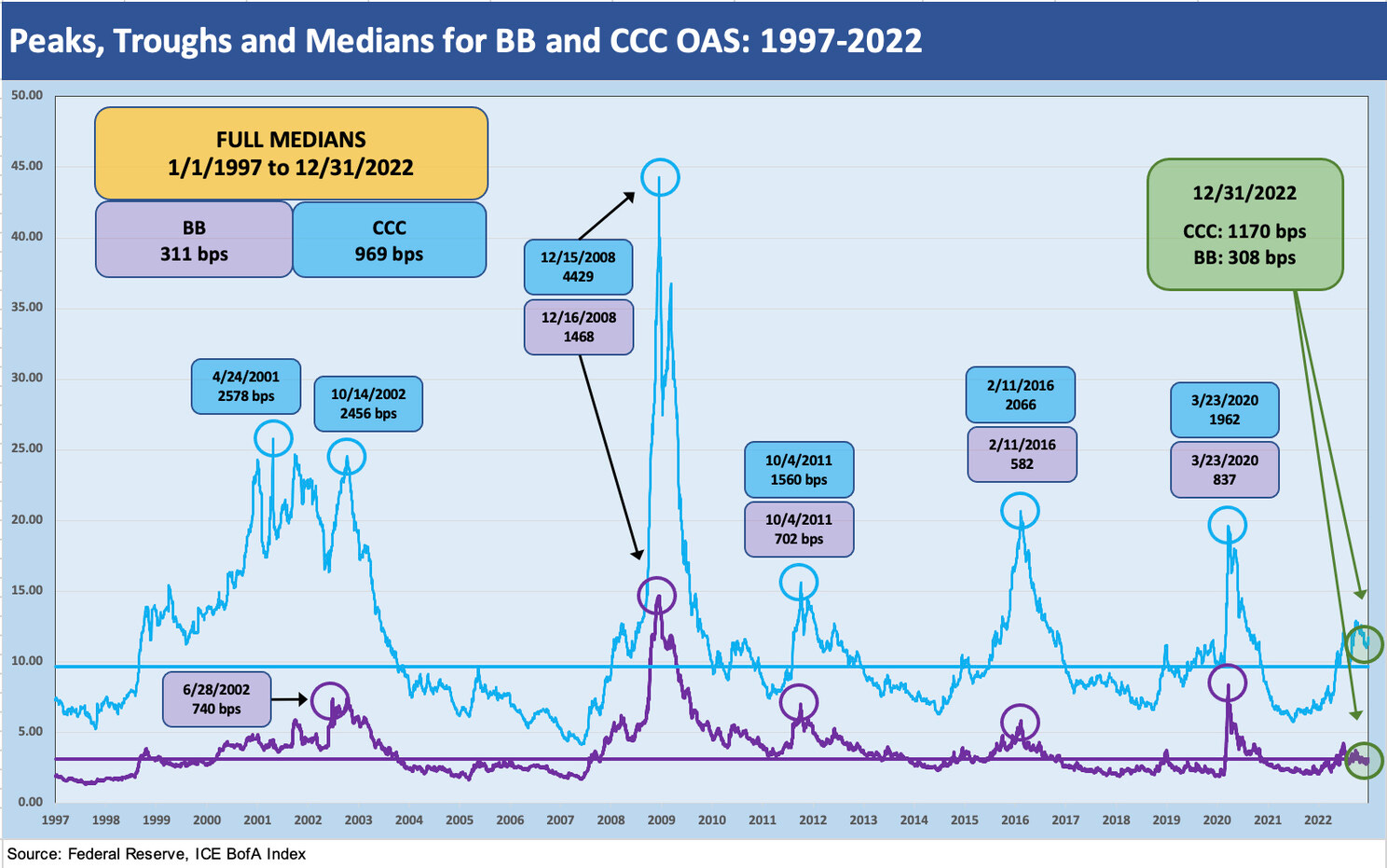 As noted on the chart, the long-term median is around 2.1X with the 1997-2007 period median at 1.9X and the post-recession trough period after June 2009 at 2.2X. That 2.2 level is right where the year ended. The ratio is likely to be biased higher in 2023 on rising default risk and weakening economic fundamentals. A strong backdrop in energy and relatively healthy consumer sector (50-year lows in unemployment) will mitigate more extreme spread moves. That said, the range of long tail outcomes do not lack transparency even if the odds are long (see Risk Trends: The Neurotic’s Checklist 12-11-22).