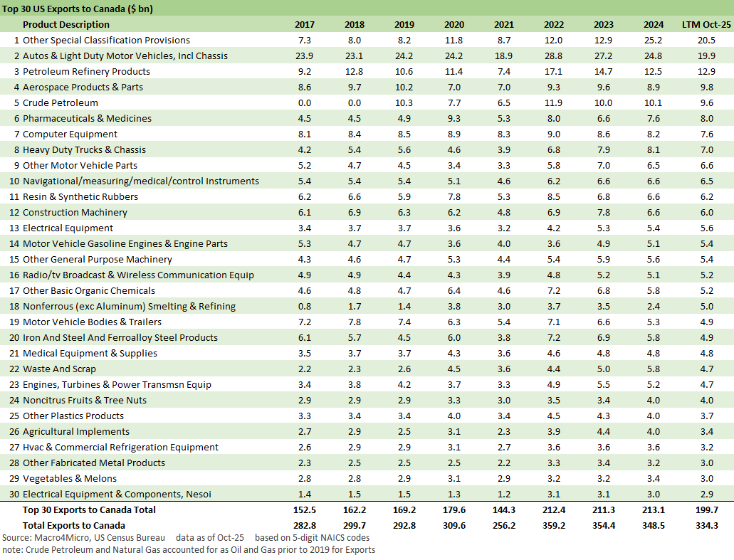 The above chart updates the export list for Canada from the US. We have looked at more than a few import-export lists across trade partners, and this is as good as it gets in size and breadth. This is a very compelling product list. A trade war would be felt on both sides.
