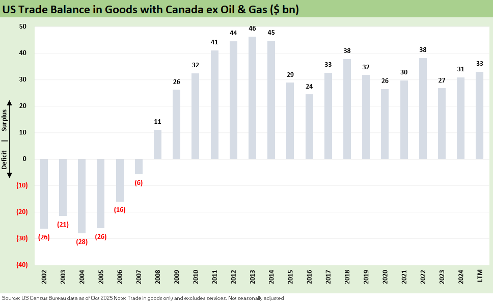 The US boasts a goods trade surplus with Canada ex-crude oil with its highly desirable, discounted heavy crudes used by US refiners.