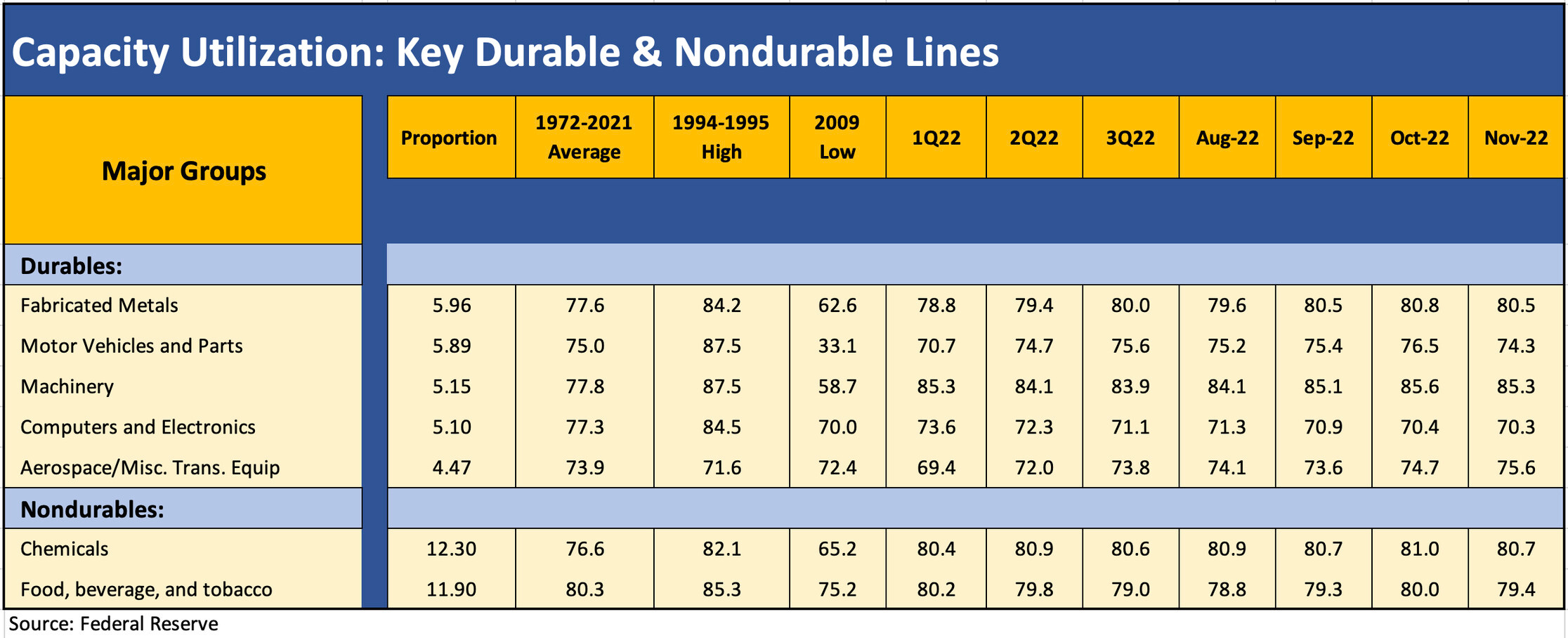 We update our view on what the capacity utilization trends look like after last month showed a pretty solid set of numbers from the durables sector (see Capacity Utilization: Durables Still Steaming Along). The prior month was steady as well (see Capacity Utilization: No Recession Numbers Yet). The sequential drop in November and noisy Fed headlines naturally will raise questions around when inventories will be normalized by sector and when downstream demand will weaken. The expectation is that the cumulative effects of Fed actions weigh on a broader cross-section of manufacturing end markets. We look at some of those key durables sectors and their line items further below, but some of the key industries held in well.