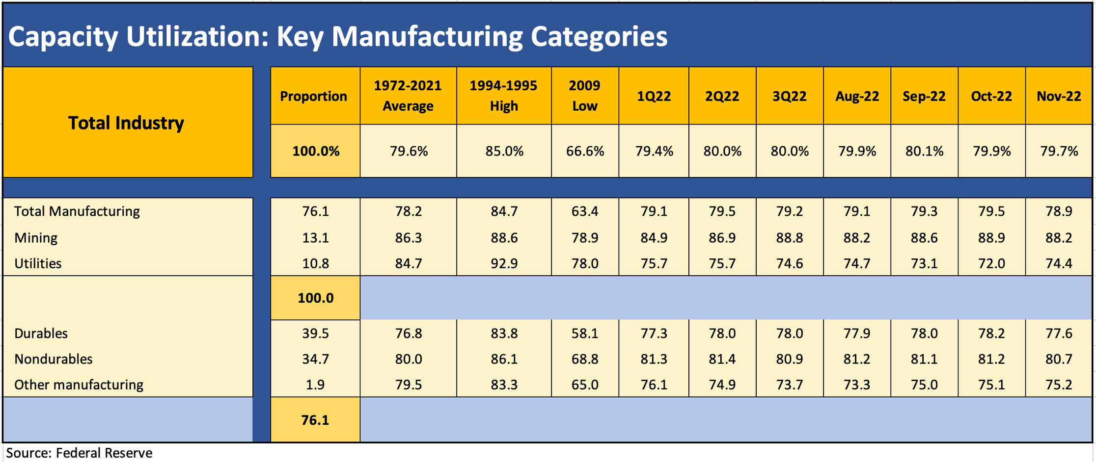 For a cyclical frame of reference, the 79.7% total capacity utilization number in Nov 2022 stacked up well against the 79.0% of Nov 2021 and the 74.4% of Nov 2020, as the vaccine was just hitting the headlines. The annual utilization number for the COVID year of 2020 was 72.6% in a year that saw three 60% handle months in April, May, and June. The pandemic distortion still put up a much better year than the crisis transition year of 2009 when utilization weighed in at 68.4 % for the entire year. The peak year since 2009 was 2018 at 79.5% with 2014 at 78.7%. By that standard, the current run rates are still quite strong despite the tendency to do some serious extrapolation to sing a Bearish tune. The recession might come but these are not close to recession numbers.