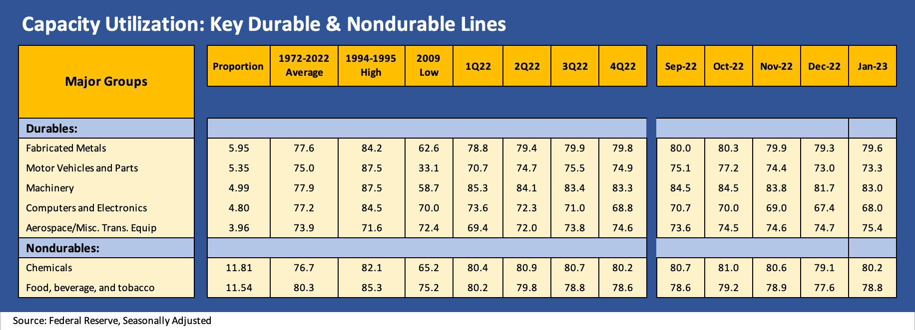 As we get into the larger categories in Durables and Nondurable that we track above, we see 7 out of 7 of the industry groups move higher. We are just emerging from the earnings season for the capital goods and auto names. We looked at some of those sectors in our last two weeklies (see Footnotes and Flashbacks: Week Ending Feb 10, 2023, Footnotes and Flashbacks: Week Ending Feb 3, 2023). The commentary from many of these reports still go into the “firm but mixed” category. Trade issues will remain a big swing factor for most.