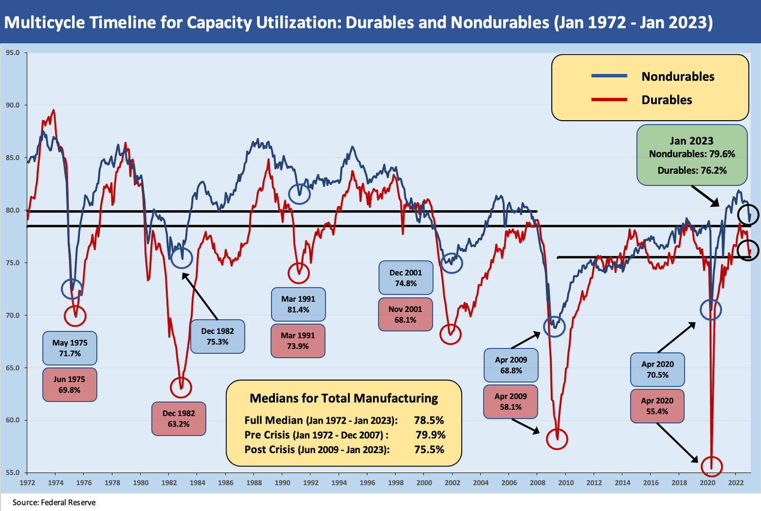 Below we break out the capacity utilization numbers derived from industrial production indicators, and we see durables and nondurables broadly stronger in January after all the revisions.