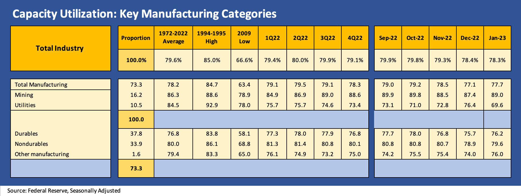 We break out the proportions for the moving parts of the total industry capacity utilization in the tables further below. With the exception of utilities hitting the lowest utilization rate since 1972, the manufacturing lines showed sequential strengthening. That came right after a very strong Retail Sales headline in the morning after a couple of weak months. Capacity Utilization was also underwhelming over the past two months, but we see January posting healthier trends in both Manufacturing (Durables and Nondurables) and Mining. These numbers are also pushing back on recession themes as that debate continues.