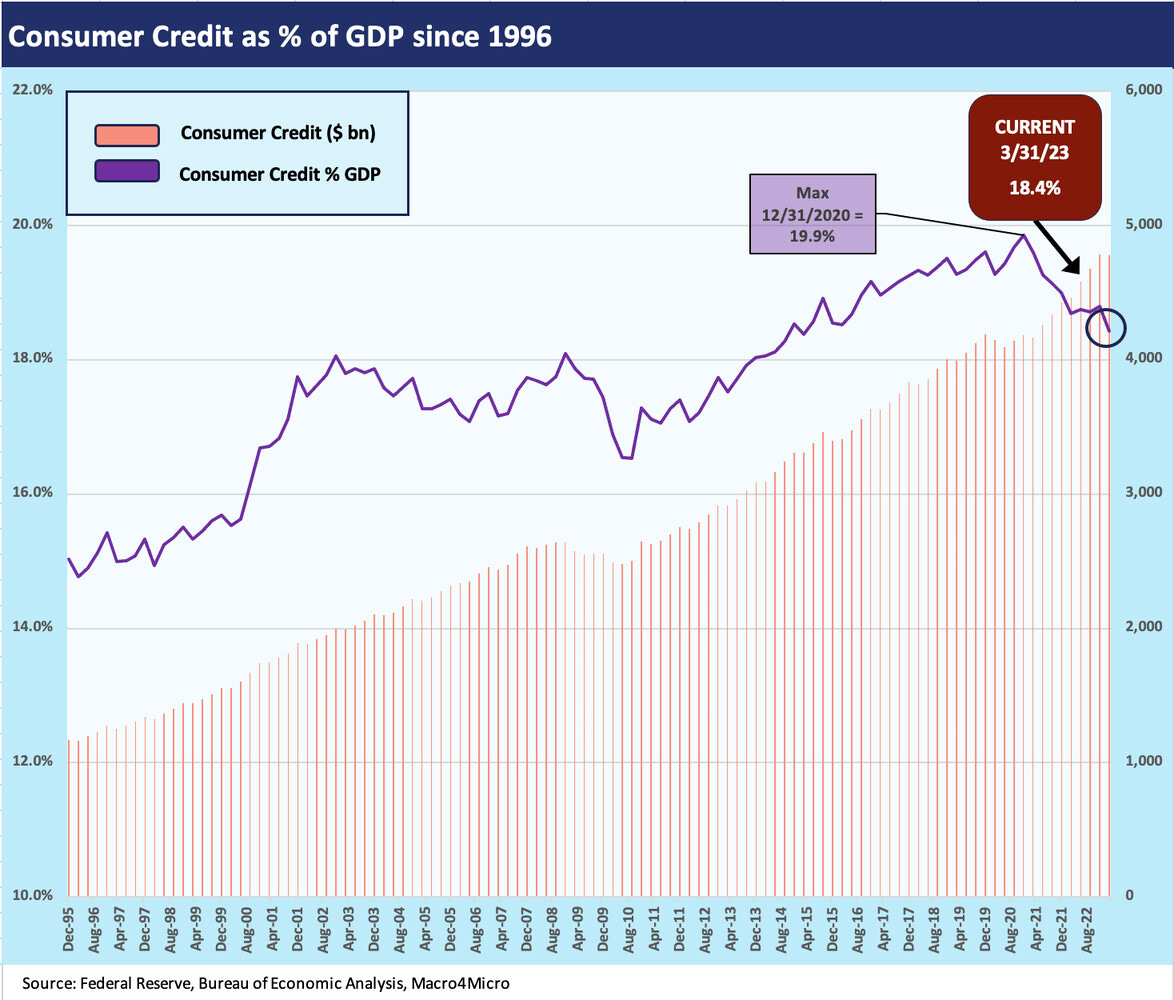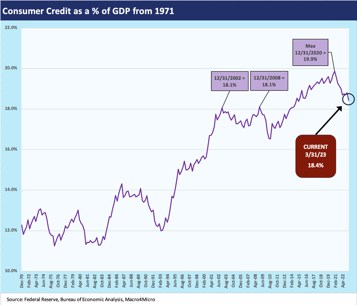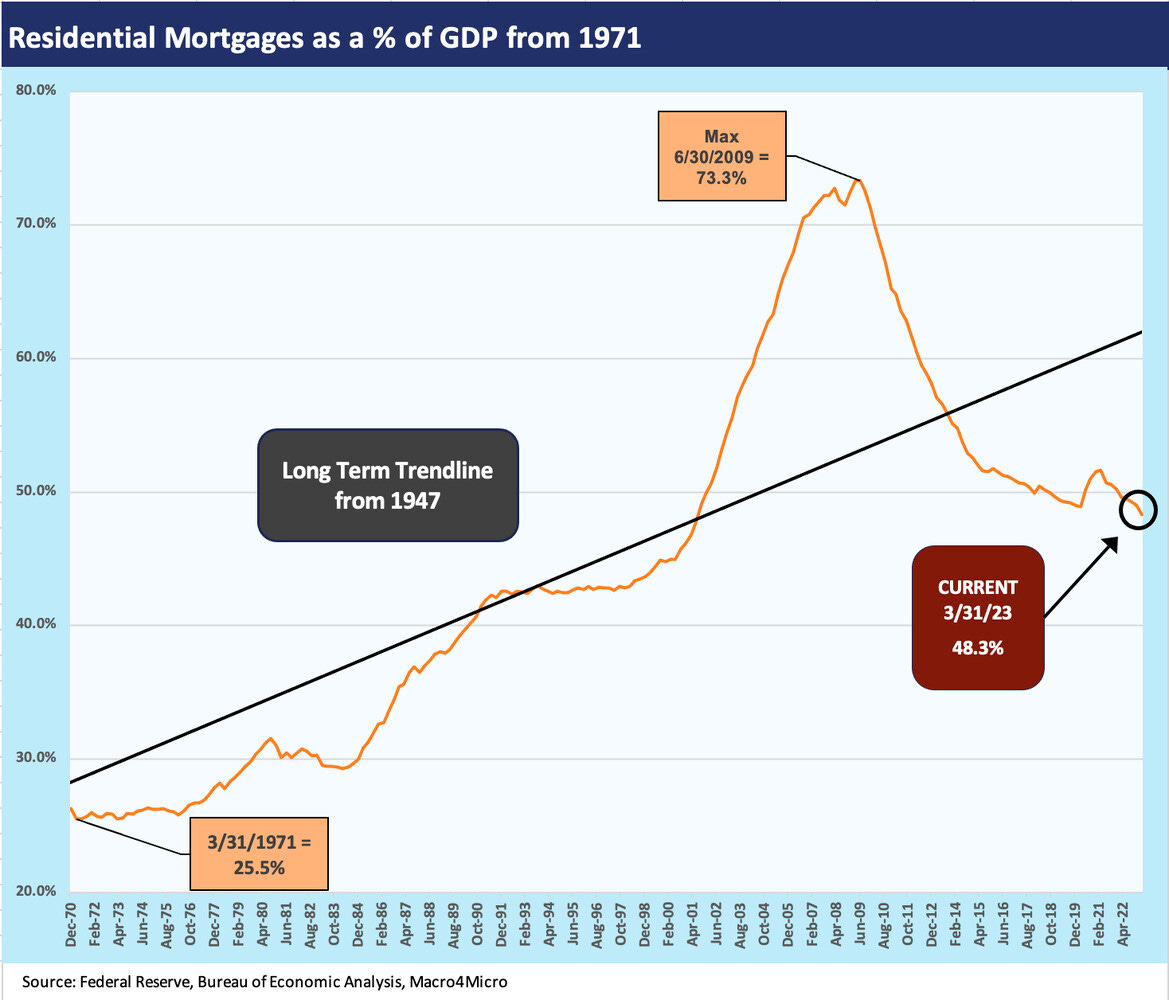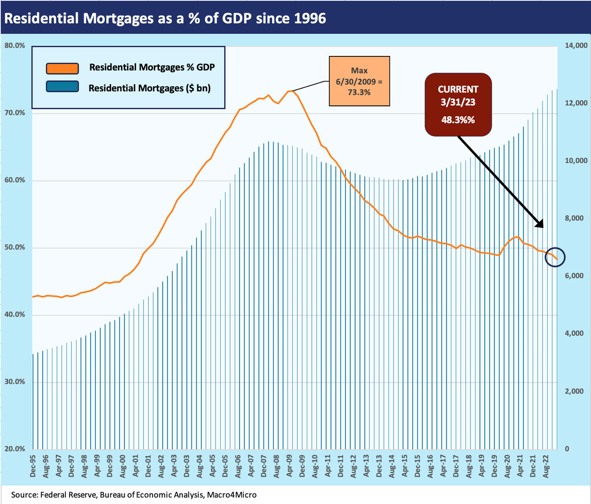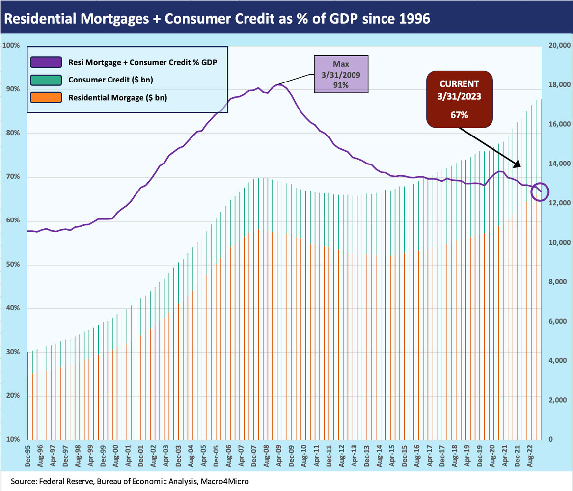 The chart above plots the combined tallies of residential mortgages + consumer credit categories as a % GDP. At a 66% handle vs. GDP, we are in a very reasonable spot in historical context. We break out the totals in the bar chart, and 1Q23 is slightly below the 4Q22 record.