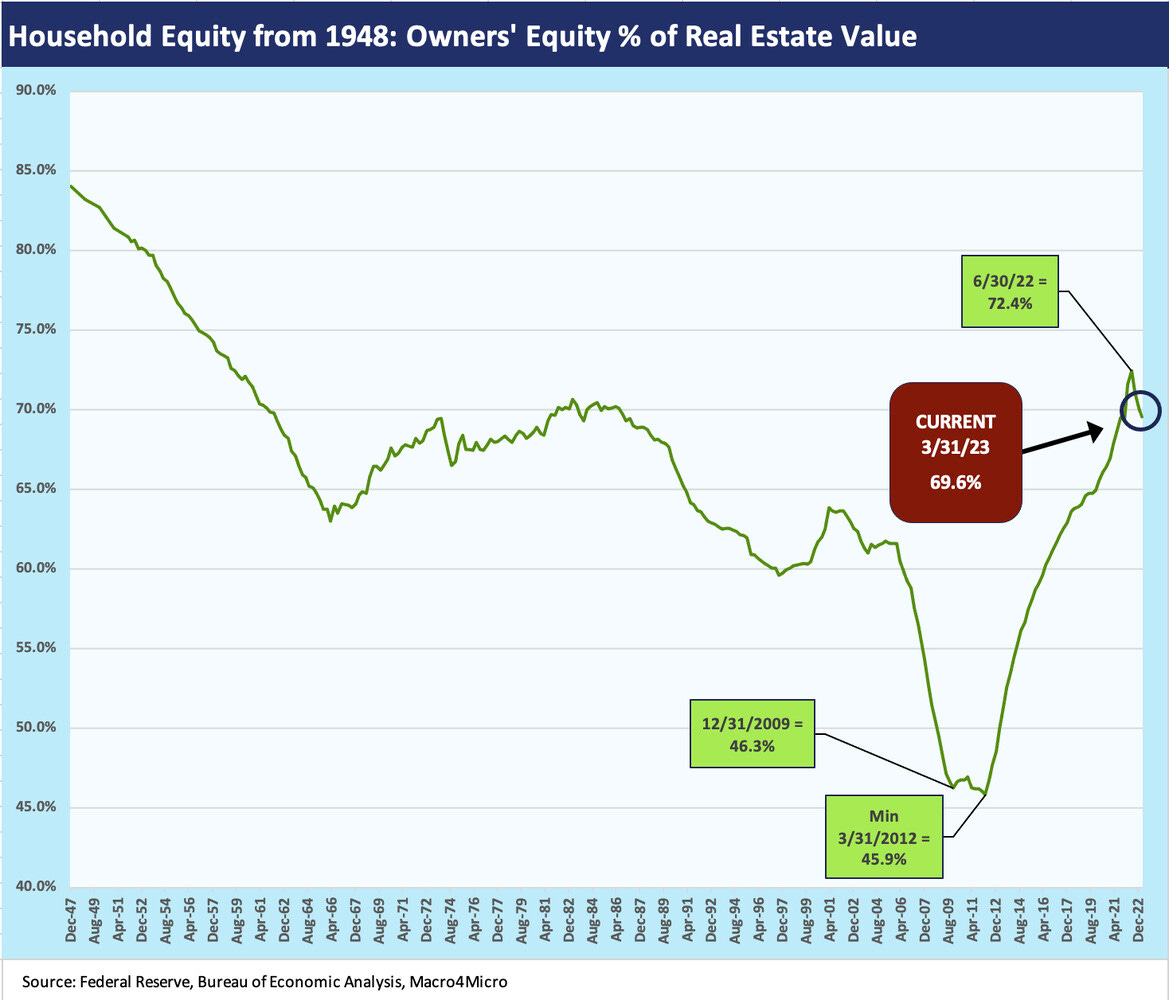 Those in financial trouble today could find ready buyers to monetize their growing home equity values. As we plot in the chart below, home equity as a % of real estate value is back to levels not seen in decades. The low mortgage rates make it harder to sell an existing home now on mortgage refinancing hurdles, but that beats the alternatives with a high base of home equity.