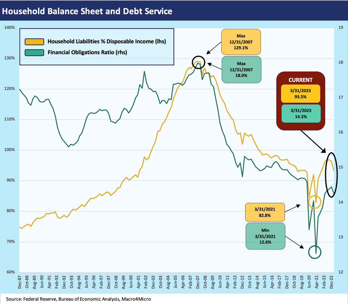 Below we frame the debt/liability levels and debt service demands. We frame the balance sheet against household income for better context. We use a two-sided chart and plot some ratios that frame how risky the household financial profiles are in aggregate. There are always outliers, but this provides a reasonable systemic snapshot.