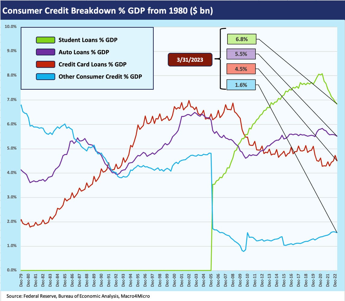 In the next series of charts, we plot the histories of the major categories of consumer credit. We frame the categories in dollar terms and as a % of GDP. As noted above, the 18% to 19% range for Total Consumer Credit the past two decades held within a range, and the analysis comes down to looking at the mix of quality across the products and which balance sheets they end up on or in what structure. We saw a blip in the debt % GDP ratio in 2020 when the denominator (GDP) was slammed during COVID, but the story across the years was more about quality mix than systemic totals.