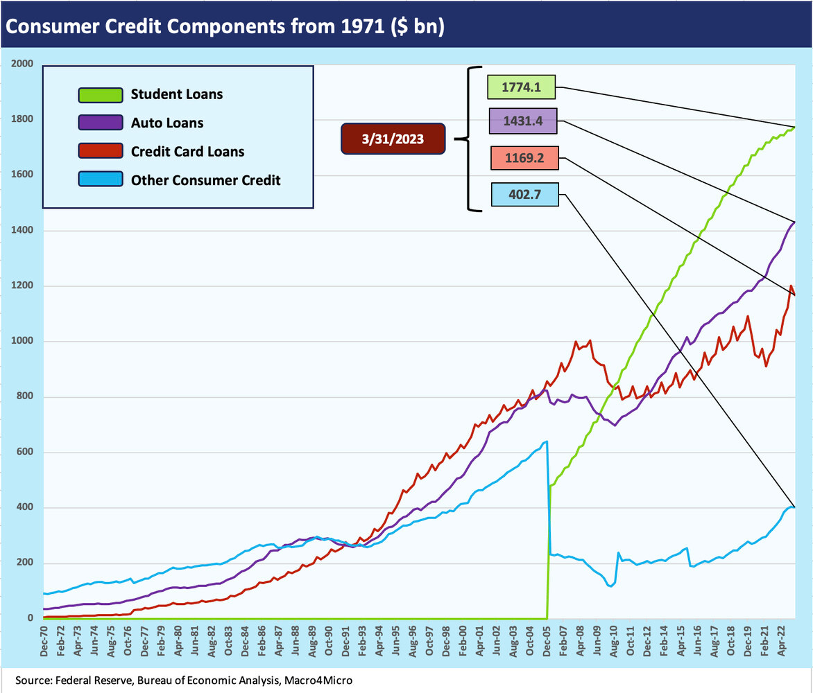 The post-pandemic cycle has seen rapid growth in consumer credit with new car supply not able to keep up with demand, but credit was more than adequate to pay the rising average transaction prices on new cars when inventory was available. Of the major categories, Auto Loans rose the fastest from 4Q19 to 1Q23.