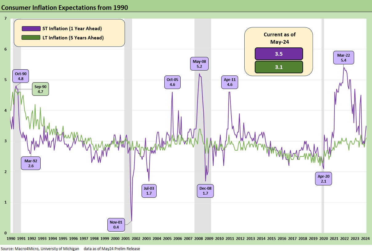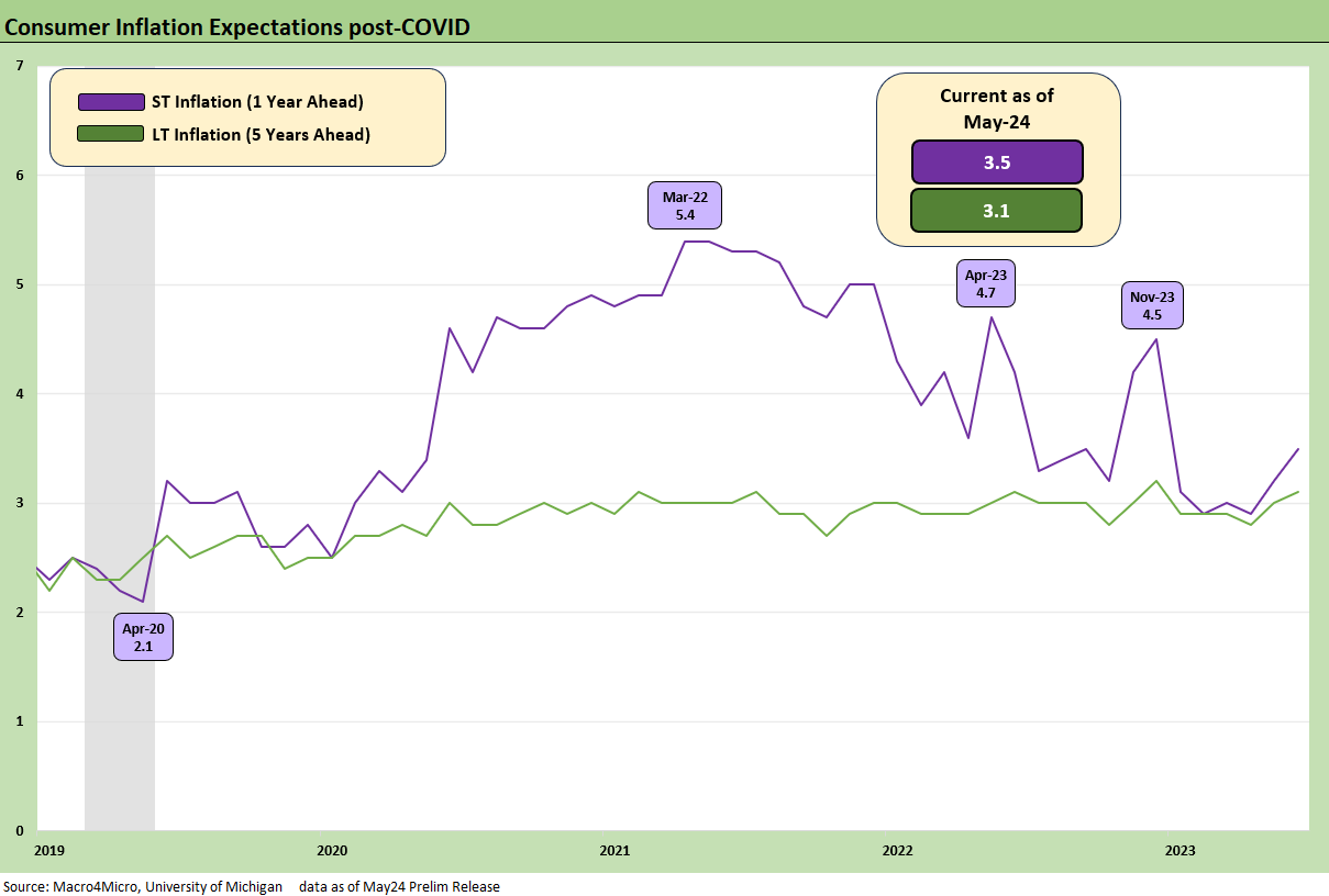 The chart above updates the time series since 2019 for the short term 1-year inflation expectations vs. the 5Y expectations. Those are not all that bad if taken in the context of the long-term differential of CPI vs. PCE. The long-term differential of CPI vs. PCE is around -0.5%, so that +3.1% number is still above the 2.0% PCE target. In other words, the +3.5% short term and +3.1% long term will keep the Fed anxious on their usual expectations worry but could signal just holding the line longer. A 4% expectations number might change that handicapping.