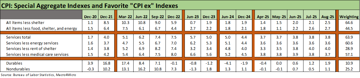 Goods (Durables and Nondurables) are low, but the Durables CPI had stepped up since the spring at back-to-back +0.4% months in July and August. Durables had exited its deflation zone on the back of tariff pressures. Nondurables MoM swung from -0.2% in July to +0.6% in August.