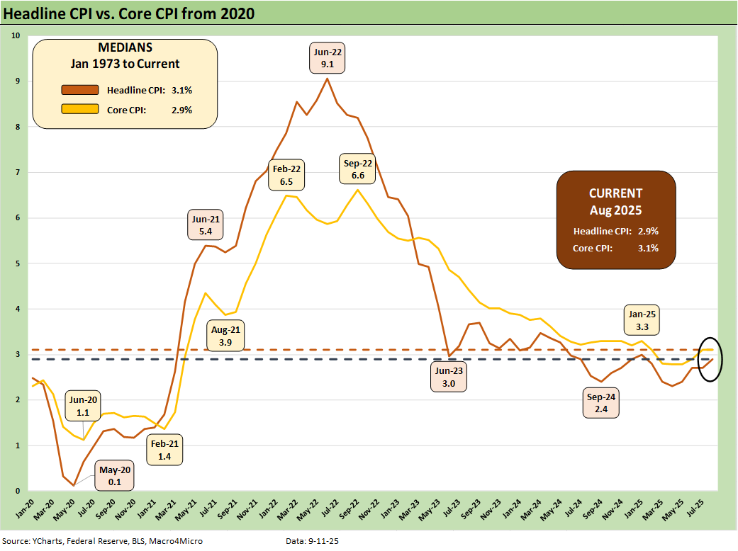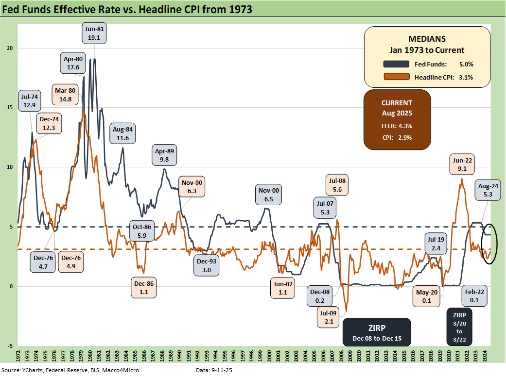The labor market pressures that are very much in evidence at this point got another data point with a weekly claims number well above consensus as CPI was released, so the FOMC ammo for a more aggressive easing is on the screen. That comes even as the market still faces a longer timeline lag on how these trade policies flow into cyclical risks via the consumer and corporate effects (see The Curve: Risk Tradeoff - Tariffs vs. UST Supply 9-1-25).