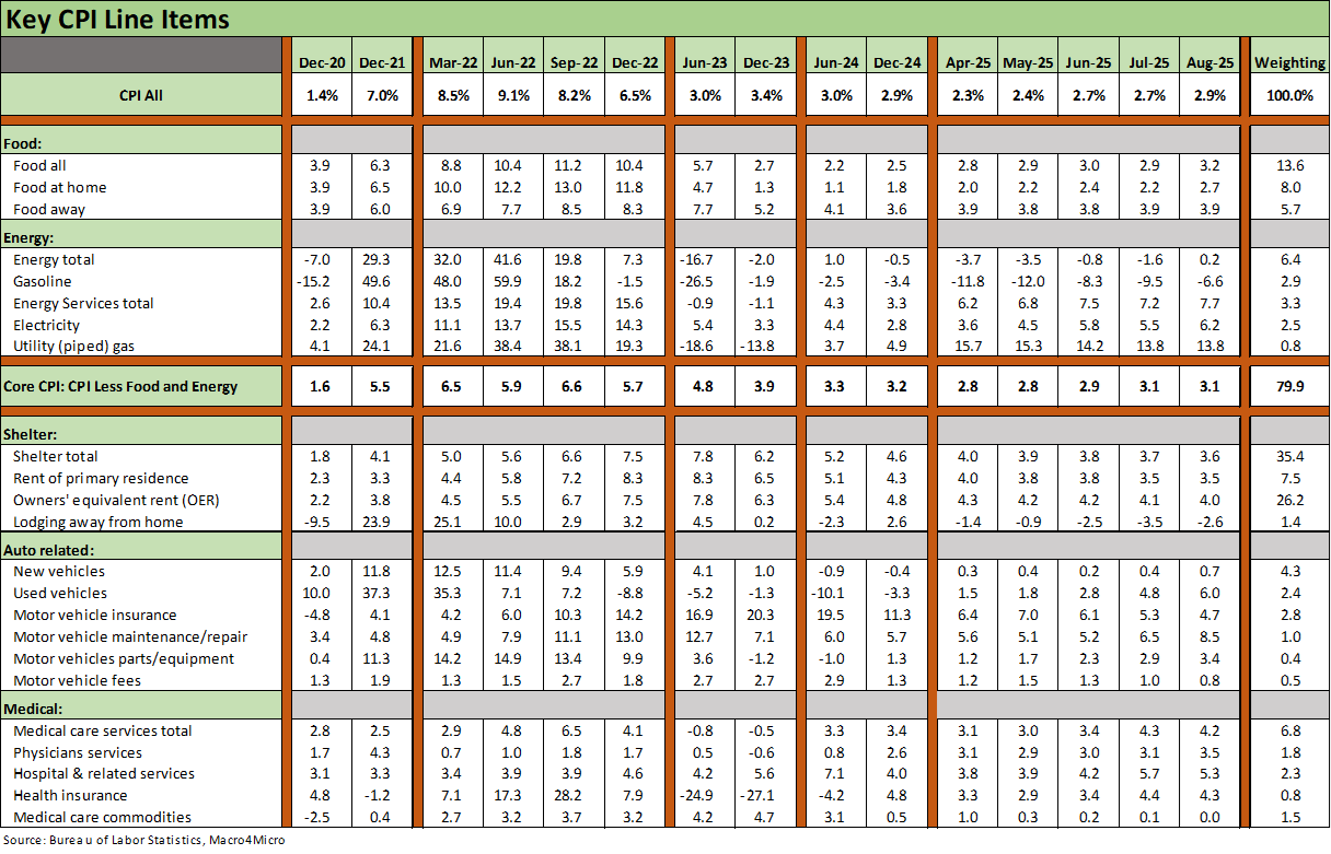 Last month we framed some of the auto tariff issues, and that is one major multiplier effects industry that bears close watching in coming months (see CPI July 2025: Slow Erosion of Purchasing Power 8-12-25). For autos, used vehicles posted +1.0% on the month (vs. negative in May and June and +0.5% in July). New vehicles also ticked higher to +0.3% MoM from +0.0% in July, and -0.3% in June and May. The OEMs remain very cautious in their strategy by eating some costs and managing the retail customer comfort zone while supporting dealer networks.