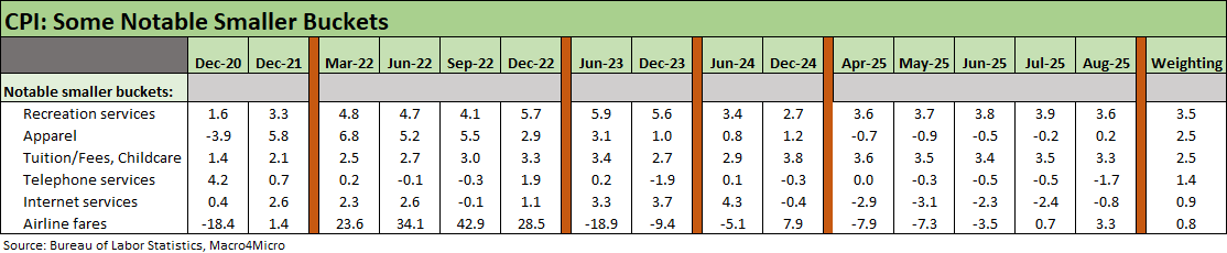 The above chart highlights some line items near and dear to households. We see some line items such as Apparel move sharply higher MoM (+0.5% August vs. +.01% July), but those apparel numbers from here will turn heavily on the IEEPA case given how that was used in slamming some of the small Asian “labor arb” countries in the reciprocal tariff program. Interestingly, Footwear tailed off sharply on a MoM basis after a big move in July. Recreation Services also tailed off MoM in August.