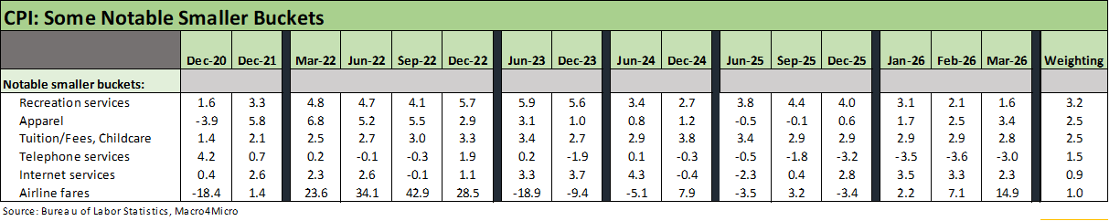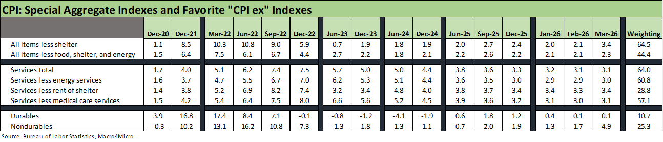 Our favorite special aggregate CPI index is “All items less shelter” (Table 3 of the release) and it has now moved from reassuring to uncomfortably high at +3.4% YoY in March 2026. As we detail below, that 3.4% for CPI ex-Shelter is up by over a point this month from 2.1% in Feb. Within that special CPI aggregate index bucket, we see “All items less food and shelter” at 3.6% and “All items less medical care” at 3.3%. That is not a pretty picture even if subject to where the Iran war crisis evolves.