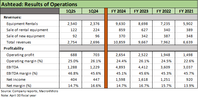 Ashtead 1Q25 results (1Q25 = quarter ended 7-31-24) were solid with the usual lofty EBITDA margins (mid to upper 40% range across the cycle) ticking slightly higher YoY from 45.6% in 1Q24 to 46.8% in 1Q25 after printing 45.1% in FY 2024. We note that AHT reports its 2Q25 results for the Oct quarter on Dec 10, 2024.