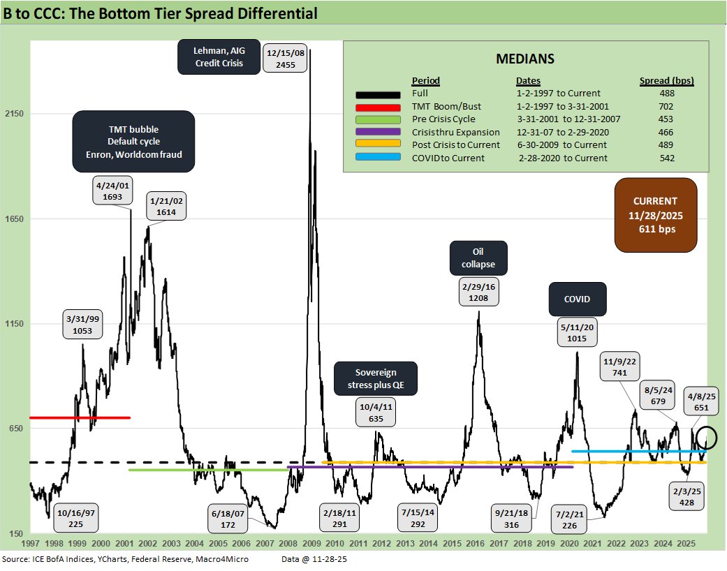 We see the peak of +341 bps after Liberation Day vs. a long-term median of +322 bps. Most of the cyclical timeline medians noted in the box had 300-handles, so the trend overall still highlights that quality spreads are offering very low compensation for moving down the credit tiers.