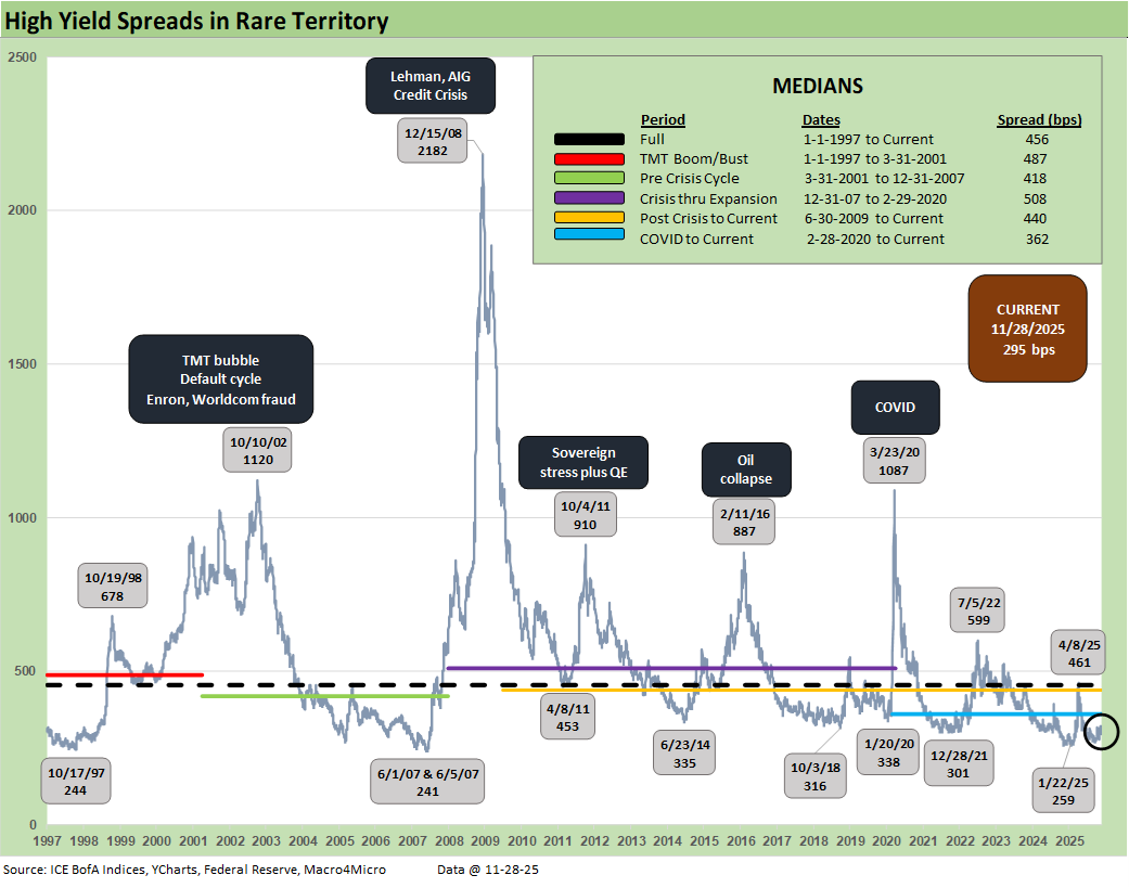 The past week’s HY move tighter to +295 bps comes against a very mixed backdrop of inputs. Recent tariff exemptions from Trump fueled more affordability headlines while the government reopening reduced the risk of more multiplier effect damage across goods, services, and payrolls. Some soft color on more recent payroll trends will not get a reality check with no October numbers. A few weeks back, job worries vs. inflation fears set off a wild 50+ point swing in the odds of a cut in the Dec FOMC meeting, but the odds are back up to 87.6% as we go to print, which is still down from the 90% handle peaks.