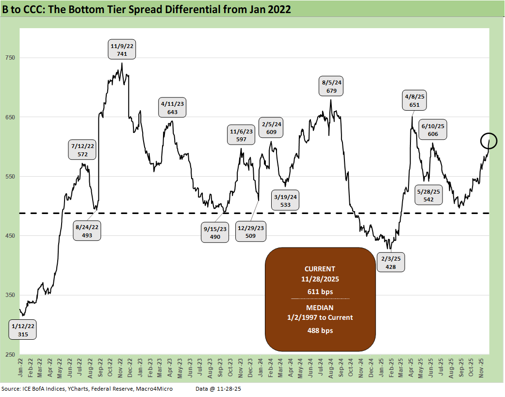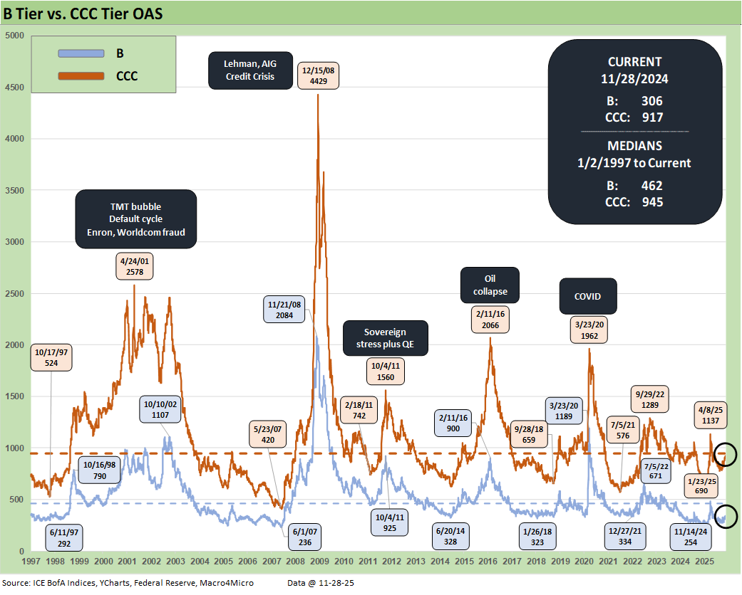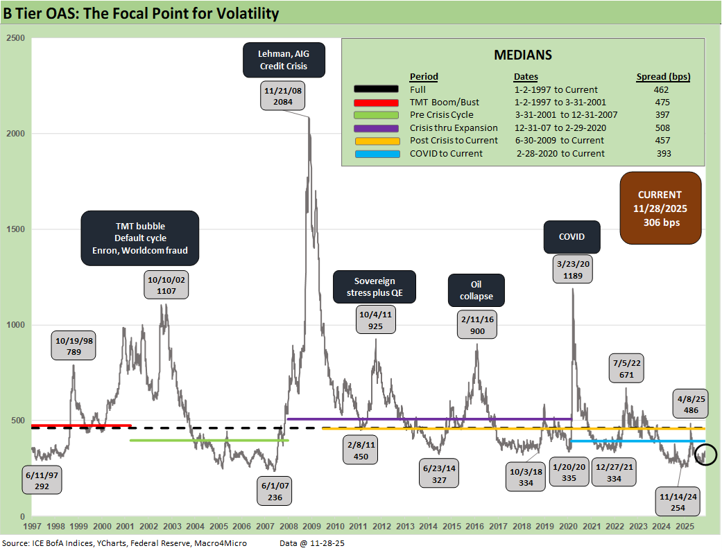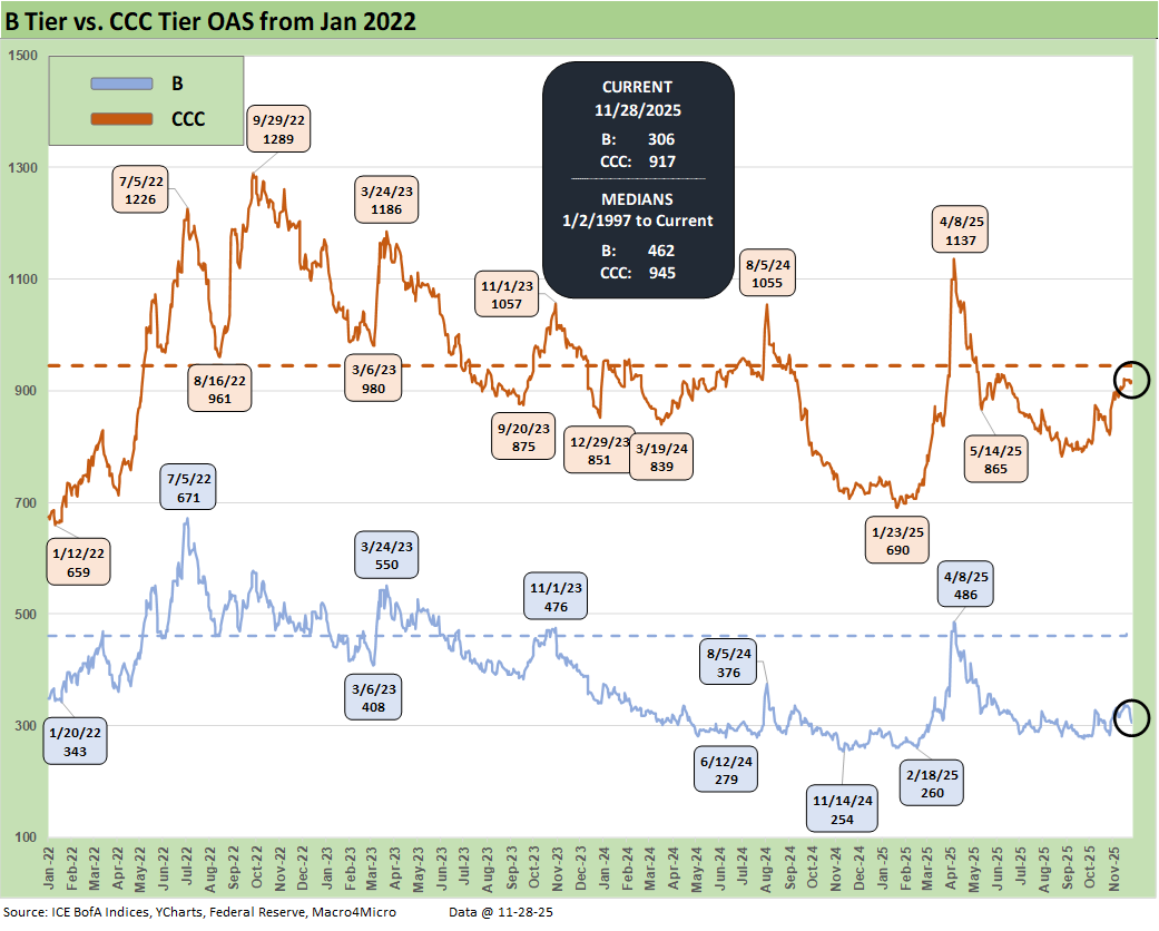 We see the Friday B tier OAS close of +306 bps, or -31 bps tighter on the week. B tier OAS had reached a post-2007 low of +254 bps in Nov 2024 before the Liberation Day fallout in April 2025 drove the B tier OAS to +486 bps. The long-term median stands at +462 bps.