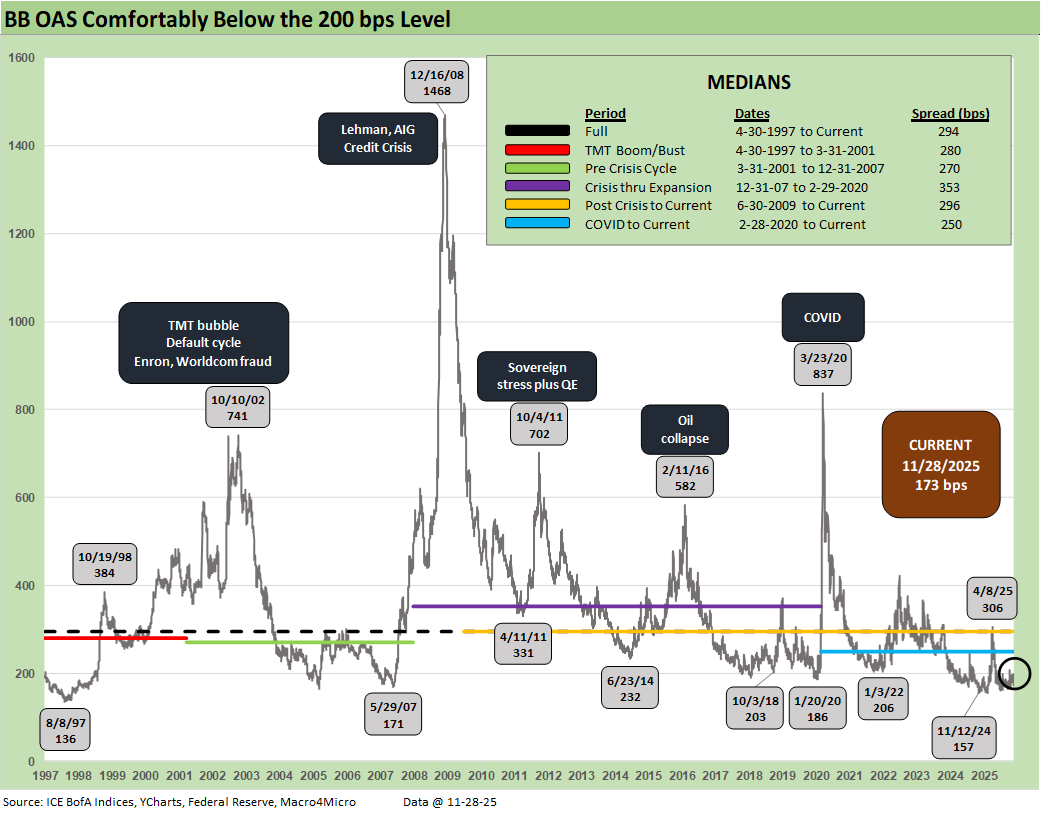 Credit spreads have stayed relatively unflappable since the Liberation Day shock treatment with a few minor spread waves along the way (brief China trade headlines). Broad fundamental weakness is hard to find, and the BB-heavy quality of the backdrop in HY is better than in what was seen in the bad old days of 2007, 2001, and 1990.
