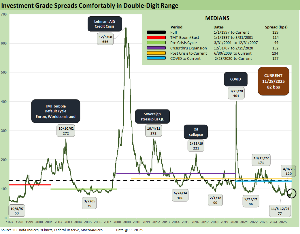 The market has also seen more second guessing on AI valuations and related debt funding needs that come with the infrastructure demands. On a positive note for credit risk, the S&P 500 earnings growth in the 3Q25 Sept quarter ran at over +10%. The fresh wave of consumer driven earnings reports came in mixed but the tone from major players such as Walmart and TJX and others were relatively constructive. The early return on holiday retail volumes (Black Friday, etc.) appears solid.