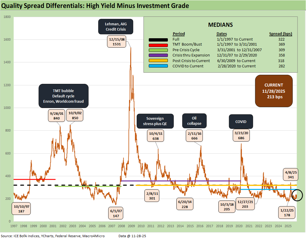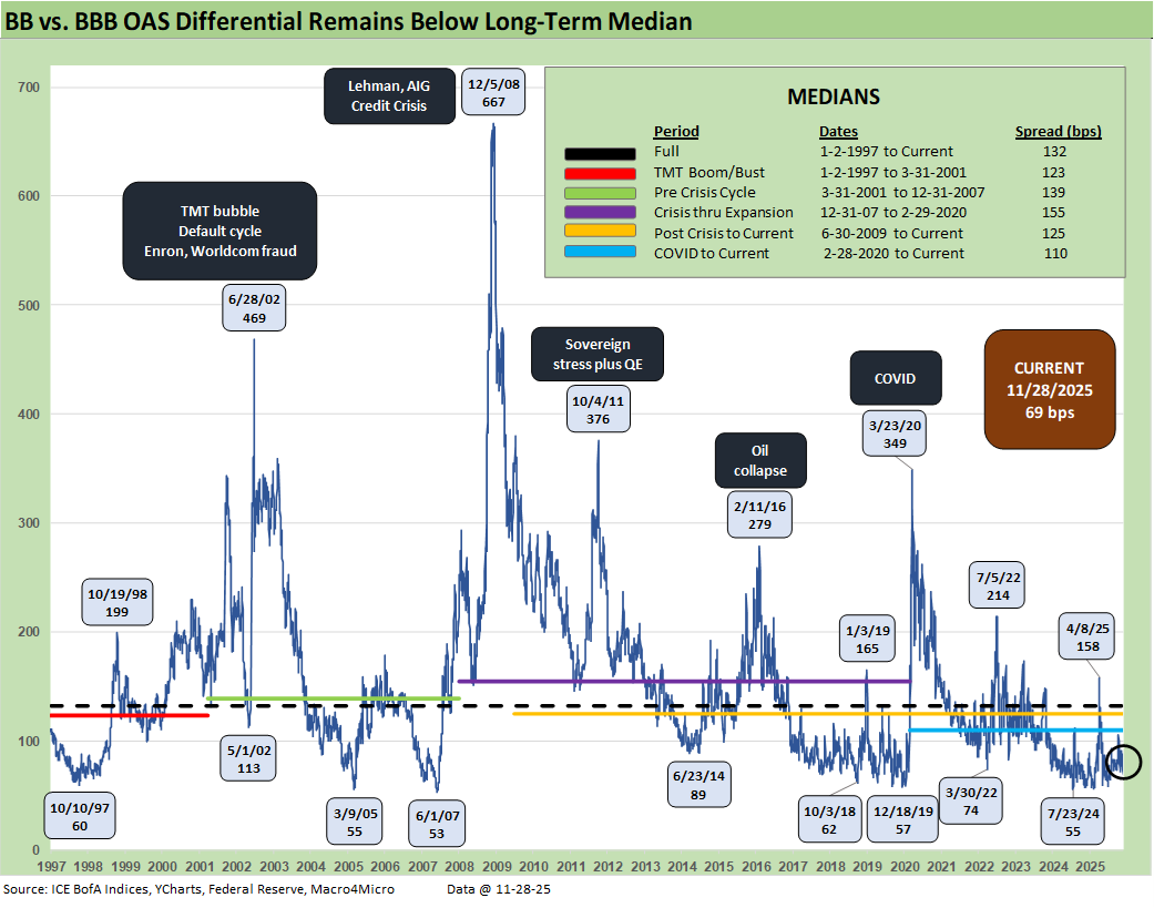 The “BB OAS minus BBB OAS” quality spread differential tightened this week ending at +69 bps, or well inside the post-Liberation Day spike of +158 bps. The long-term median of +132 bps is consistent with the medians across the credit cycles detailed in the box.
