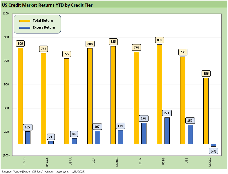 The above chart updates the YTD 2025 excess returns and total returns for IG and HY across the credit tiers. The support of the UST curve is clear enough in the total return numbers YTD. We see the BB tier winning the YTD lead in both total returns and excess returns, so the HY lite strategy has been rewarded.