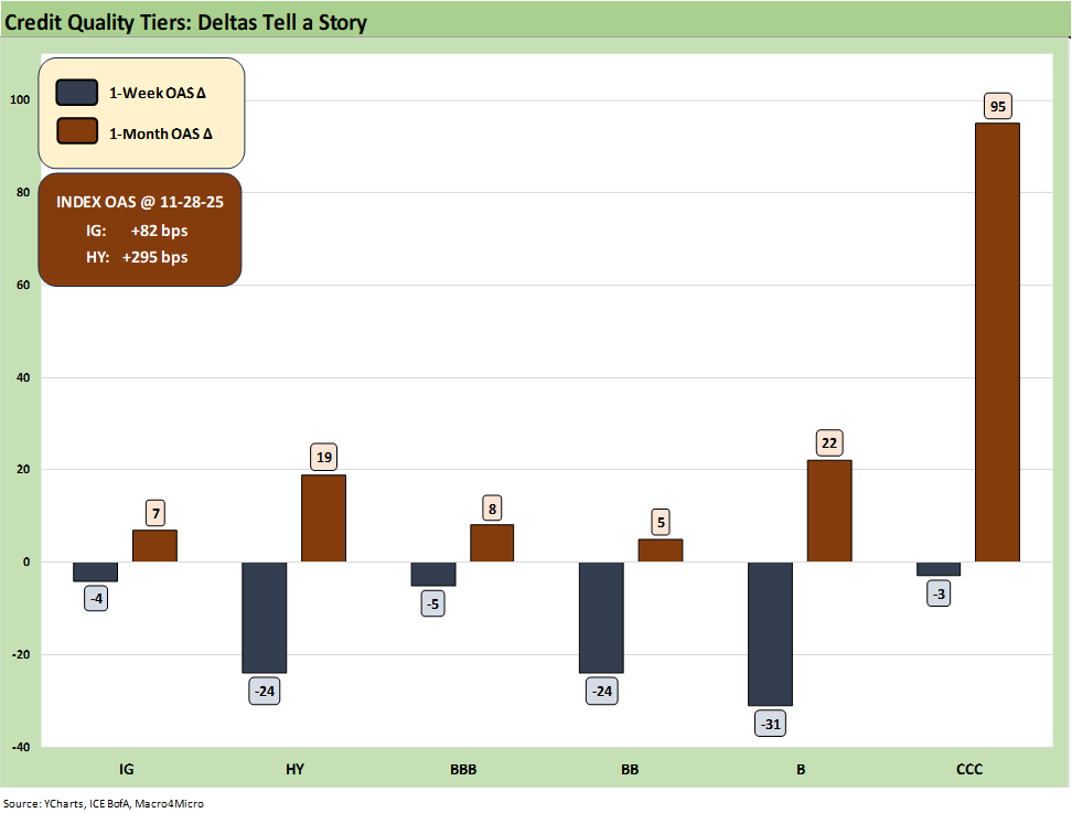The above chart updates the 1-week (through 11-28) and trailing 1-month spread deltas for IG and HY and from the BBB to CCC tiers. Last week closed on Friday at -24 bps tighter on the week in HY and -4 bps tighter in IG. Despite a banner spread rally and a dazzling week in equities, HY spreads are wider for the trailing 1-month period by +19 bps and equities limped home in what was a weak rolling 1-month period (see Market Commentary: Asset Returns 11-30-25).