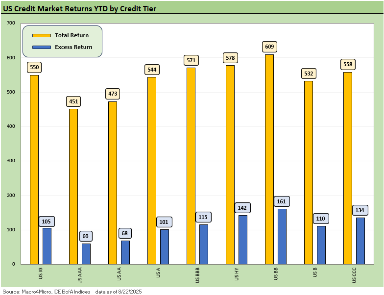 The above chart updates the YTD 2025 excess returns and total returns across IG and HY and the credit tiers. The support of the UST curve and spread compression is clearly reflected in the returns with the BB tier still the best positioned of the lot in the balance of credit risks and duration risk.