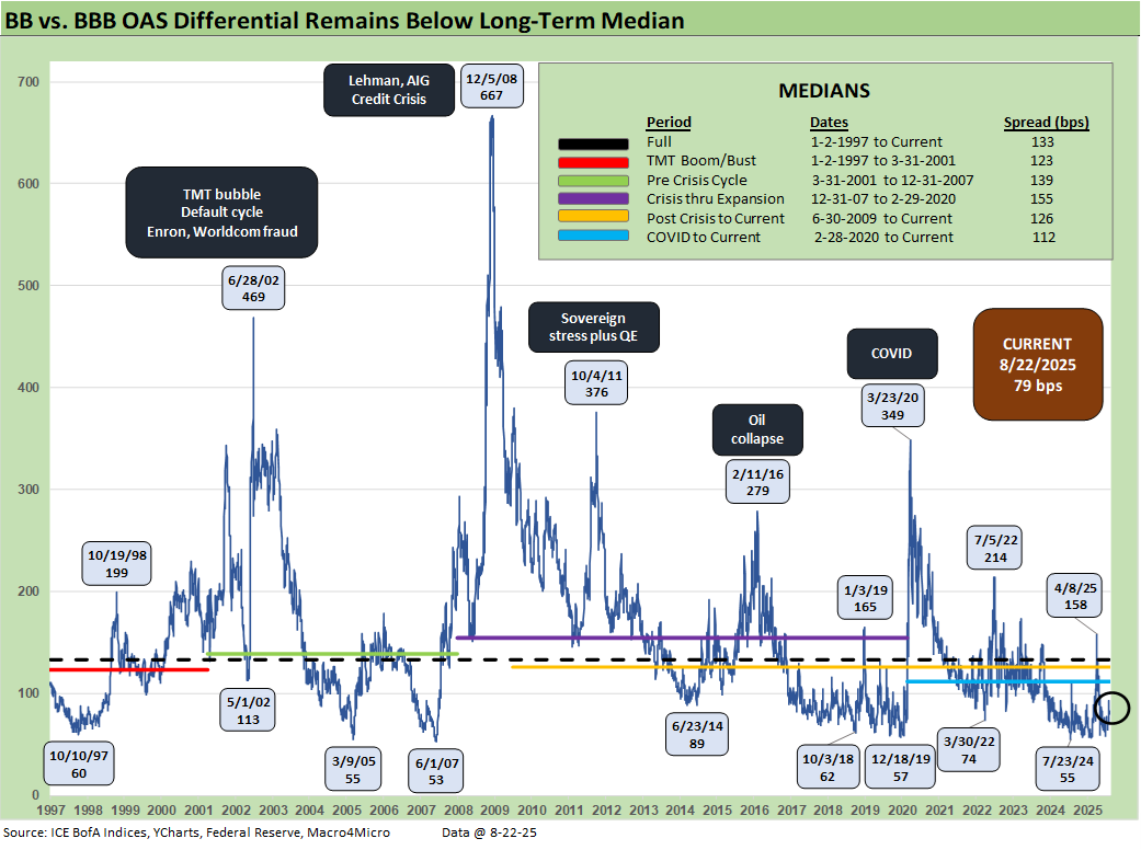 The above plots the time series for the BB tier across the cycles. The current sub-200 bps level of +176 bps is impressively tight, but we have been lower in 4Q24 at +157 bps. The long-term median of +296 bps is in a different zip code.
