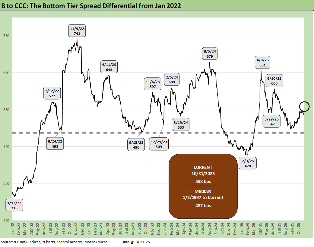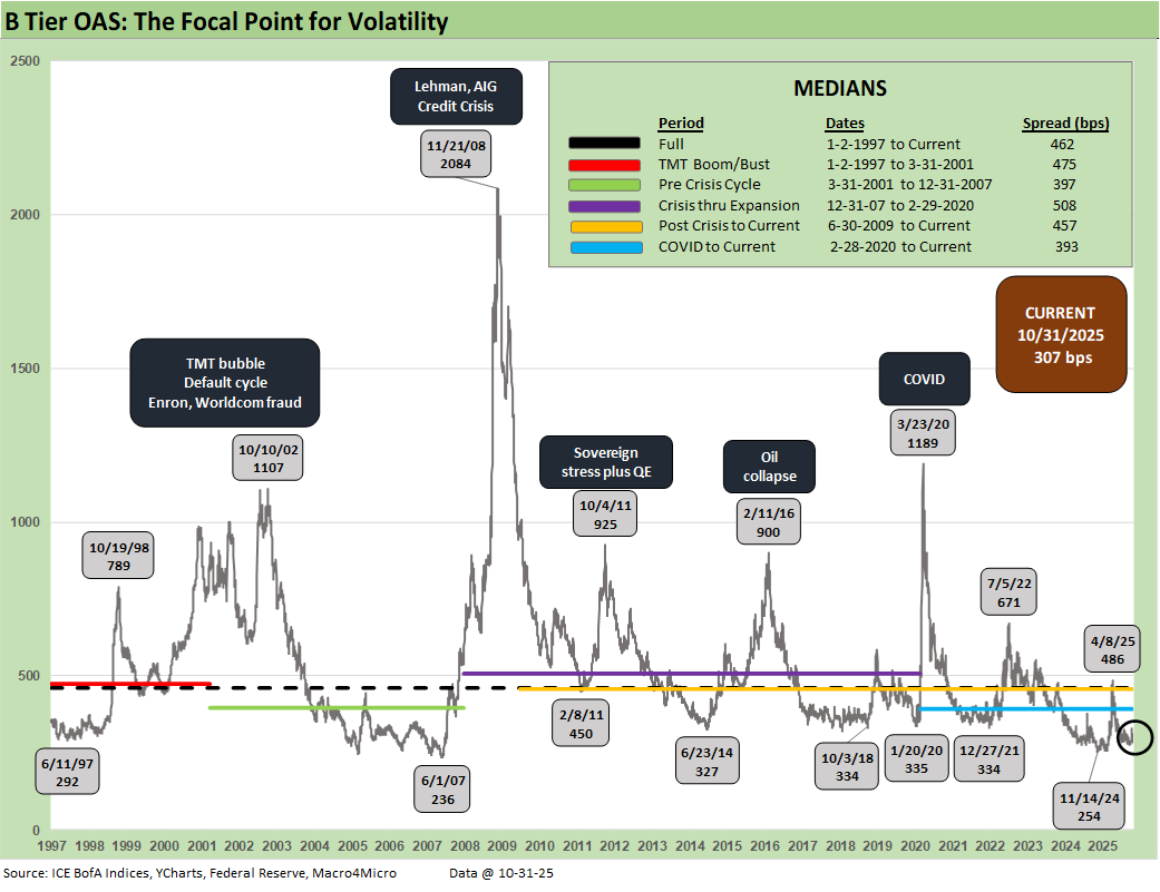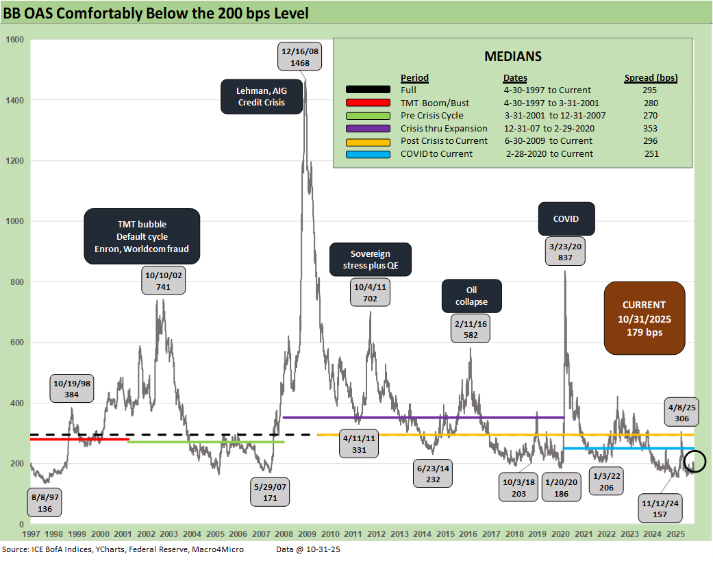 The HY bond index default cycle is very much in check. The distress and debt exchange actions will be weighed more heavily (and for the most part quietly) over in private credit as the year plays out. That said, we have two very noisy private credit situations (Tricolor, First Brands) that dominated the headlines in recent weeks with the potentially massive fraud chatter around First Brands and some grim commentary around Tricolor. We have seen subprime auto finance defaults before – even in IG commercial paper issuers – so that is not a Loch Ness moment. First Brands could have some auditors facing some risks, and the banker due diligence team might get a “time out” from management.