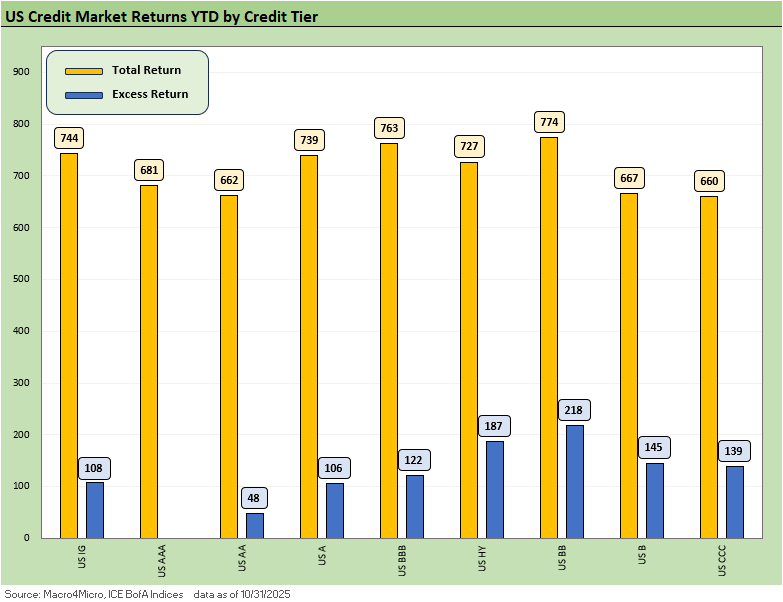 The above chart updates the YTD 2025 excess returns and total returns for IG and HY across the credit tiers. The support of the UST curve is clear enough in the total return numbers, but those tailed off sequentially on the UST action. The YTD excess returns were mixed in trends on the week on spread contraction prior to the rebalancing with HY excess return increasing to +187 bps YTD. The IG excess return declined sequentially to +108 bps YTD from +131 bps last week.