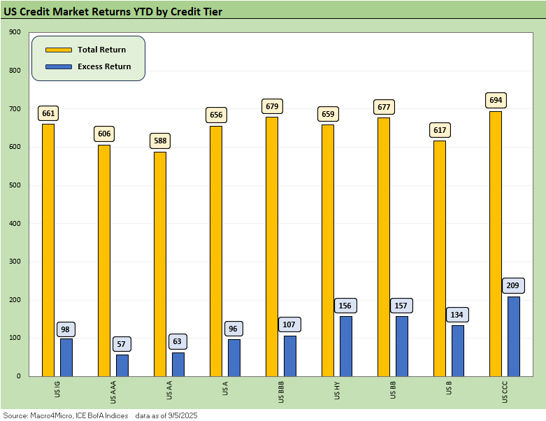 The above chart updates the YTD 2025 excess returns and total returns across IG and HY and the credit tiers. The support of the UST curve and spread compression is clearly reflected in the returns with the BB tier still the best positioned of the lot in the balance of credit risk and duration risk.