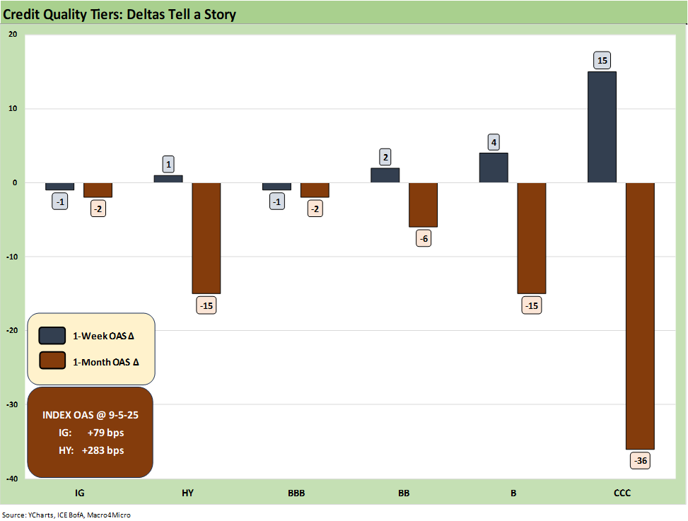 We see the peak of +341 bps after Liberation Day vs. a long-term median of +322 bps. Most of the cyclical timeline medians noted in the box had 300-handles, so this trend overall highlights that quality spreads are offering low compensation for moving down the credit tiers.