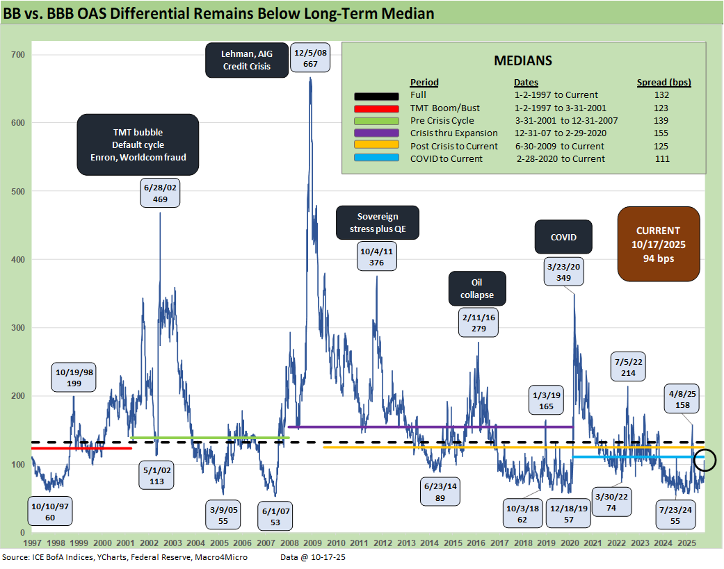 The “BB OAS minus BBB OAS” quality spread differential pushed lower by -11 bps to +94 bps on the week, or well inside the post-Liberation Day spike to +158 bps. The long-term median of +132 bps is consistent with the medians across the credit cycles detailed in the box.