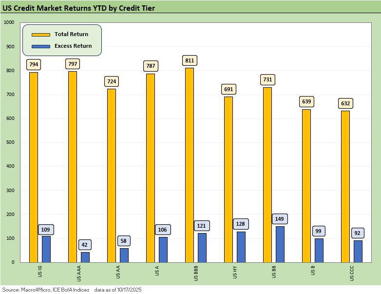 The above chart updates the 1-week and trailing 1-month spread deltas for IG and HY and from the BBB to CCC tiers. Credit risk pricing improved over the week as Trump backpedaled on China threats and the major banks brought solid 3Q25 earnings. We also heard very constructive news on the consumer from bellwethers such as American Express and Synchrony with Cap One teed up for this week with sentiments echoed by JPM and BofA on consumer credit quality in the middle and upper tiers.